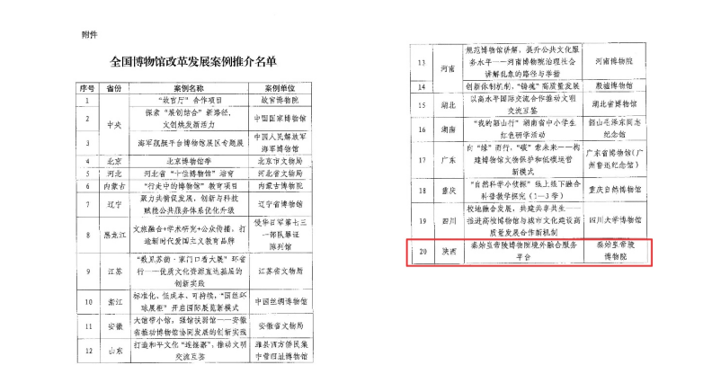 近日,国家文物局公布全国博物馆改革发展案例推介名单,“秦始皇帝陵博物院境外融合服务平台”案例成功入选。此次案例推介是国家文物局系统总结近年来博物馆领域改革发展成果,在全国博物馆遴选出20个项目后予以公布。