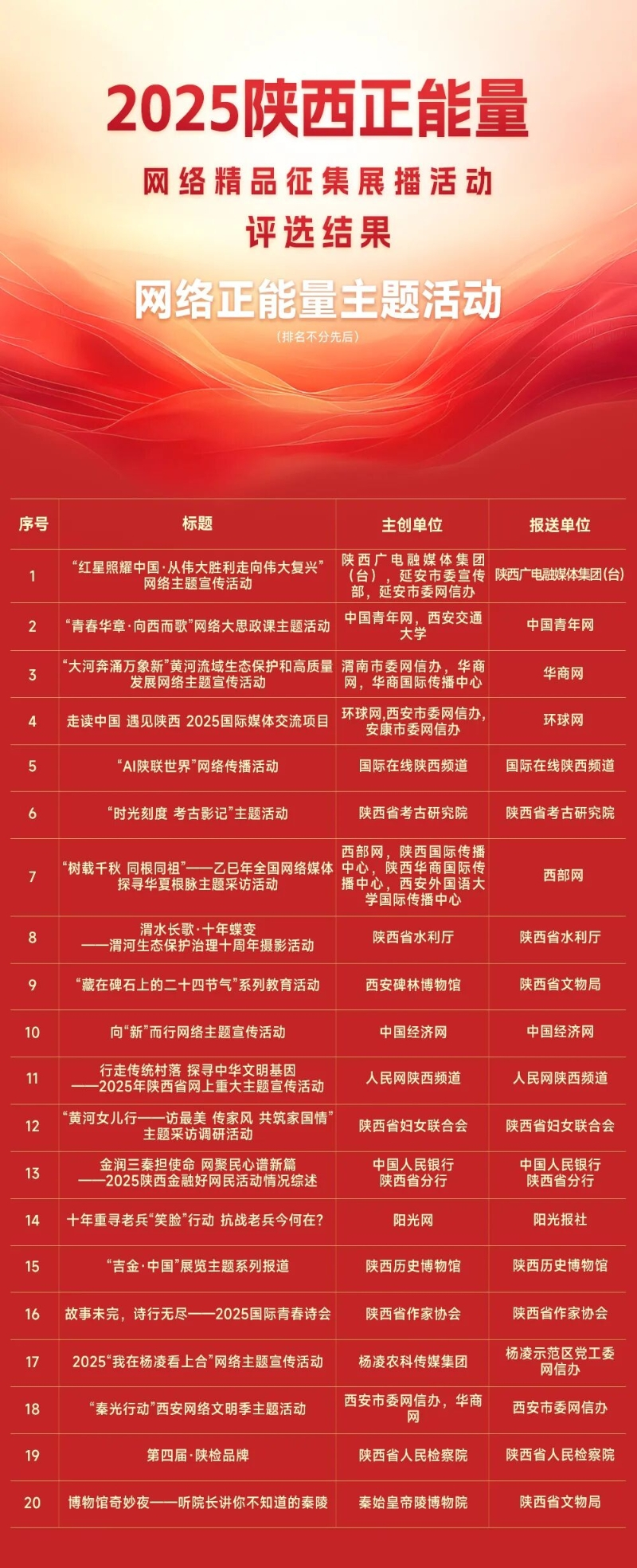 2025年陕西正能量网络精品征集展播活动聚焦全省年度重大部署和发展成就,以全网联动、全民共享为载体精心遴选推出一批群众认可、传播广泛、影响力强的网络正能量精品。活动收到省内党政机关、人民团体、社会组织、企事业单位、中央驻陕和省内新闻单位、新闻网站、商业网站平台等112家单位报送作品2226件,经过公开征集、评审等环节,评选出100件网民认可、社会认同、影响广泛的网络精品。