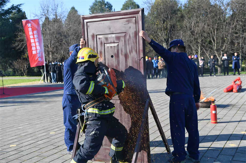 本次综合演练分为消防技能展示环节和消防实战演练两个部分。消防技能展示三个科目,博物院专职消防员展示消防服快速穿戴及消防水带抛接两个科目,临潼消防救援大队与博物院消防站共同展示快速破拆救援科目。消防实战演练模拟丽山园施工人员违规使用取暖设备引燃活动板房,火势借助风力引发森林火灾的场景,设置了从巡查发现火情、信息核实上报、启动应急响应,到人员紧急疏散、田野文物核心区应急防护、现场秩序维护、医疗救助,直至与当地消防力量协同扑灭火情的完整链条。
