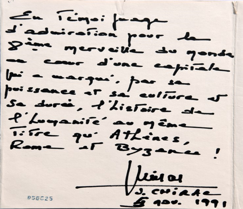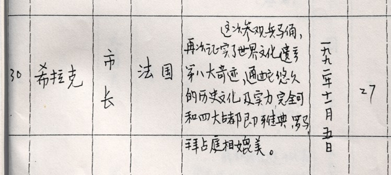 1991年11月5日,希拉克先生第二次访问秦俑博物馆。当他再一次观赏雄伟的秦俑军阵后,欣然在留言簿上写道:“这次参观兵马俑,再次证实了世界文化遗产第八大奇迹,通过它悠久的历史文化及实力,完全可以与世界文明古都雅典、罗马、拜占庭相媲美。” 希拉克高度评价西安悠久的历史文化。他说:“世界应有四大文明古都,即希腊的雅典、意大利的罗马、土耳其的伊斯坦布尔(拜占庭)和中国的西安。”希拉克在其回忆录《步步为赢》中对西安有专门描述:“西安也让我很震撼,西安在好几个世纪里都是世界上人口最多的城市之一,是繁荣的文化和艺术中心,建立大秦帝国,统一中国的始皇帝就葬在西安,他的陵墓有大军守护,秦始皇陵还没有打开过,我赞成保持原样,以免造成破坏。据说,整座陵墓是一座陶土制成的城池,中间有一道水银河穿过,覆于城上方的穹顶表面记录了当时中国人全部的天文知识,比其他民族都要先进,这座陵墓至今还隐藏着许多未知的秘密……”